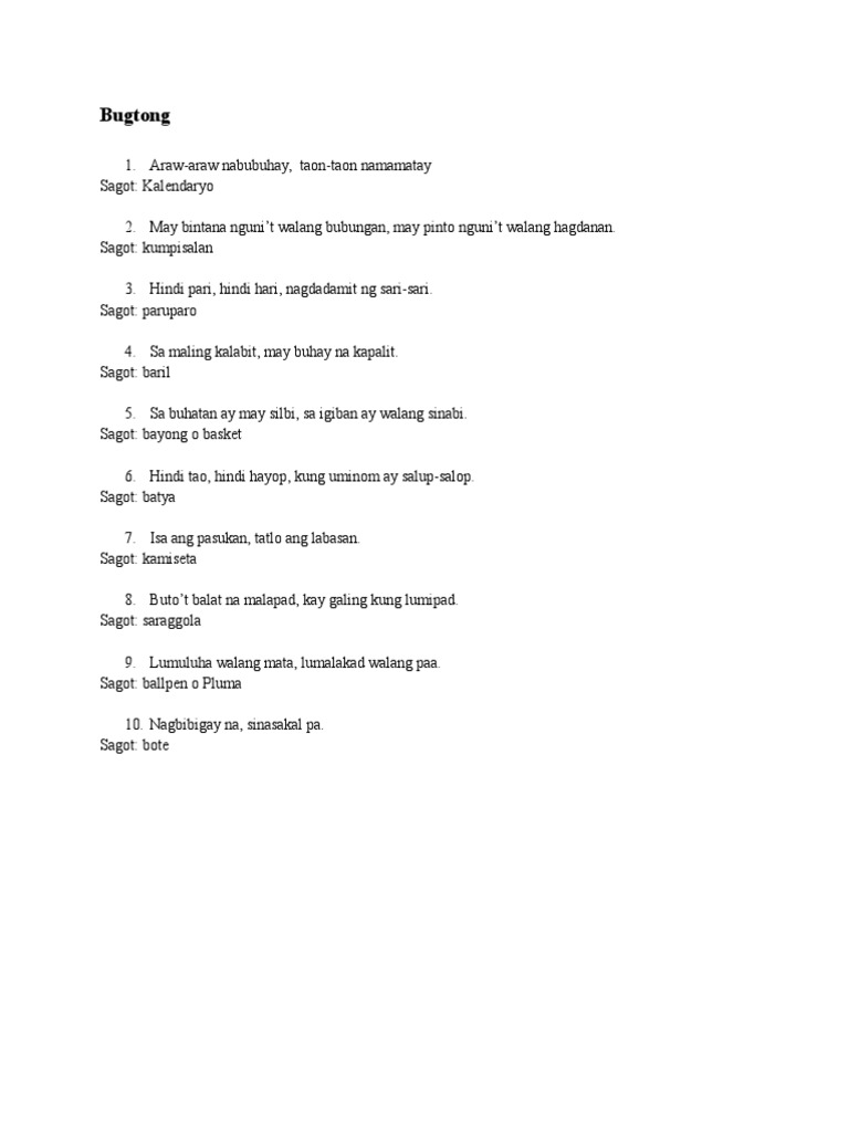 Ito ay isang maikling tula na kalimitan ay patanong at patungkol sa pag-uugali kaisipan pang-araw-araw na buhay at katutubong paligid ng mga. Butot balat na malapad kay galing kung lumipadSagot. Hindi ako sikat na pilosopo tulad ng henyong kapangalan ko pero mahal din ako ng tao dahil kinakainan ako.