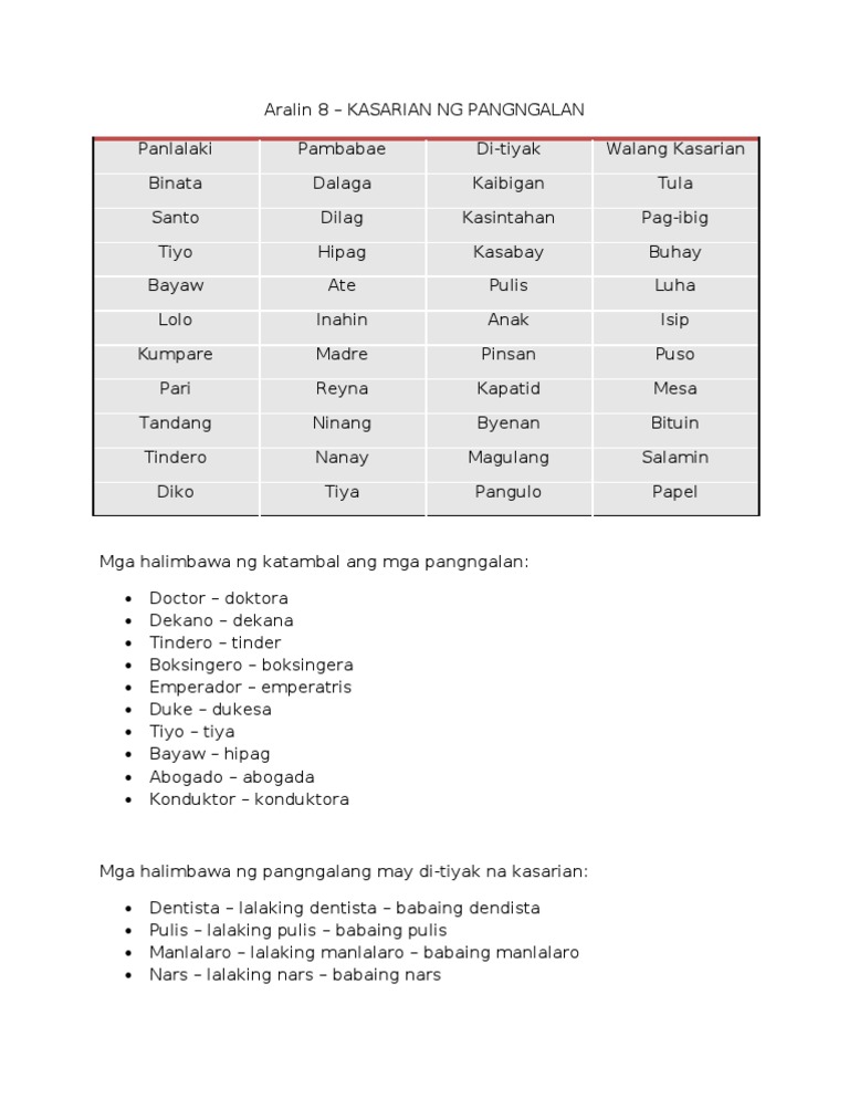 Aralin 8 Kasarian Ng Pangngalan Pdf